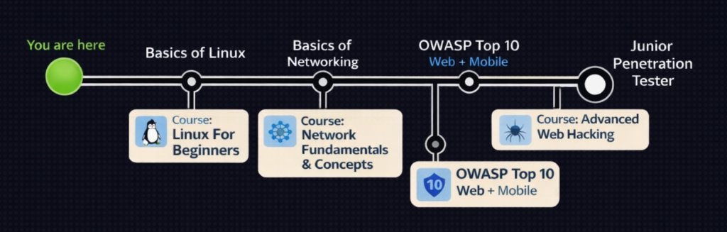 Build solid fundamentals in Linux and networking before moving to advanced security topics.